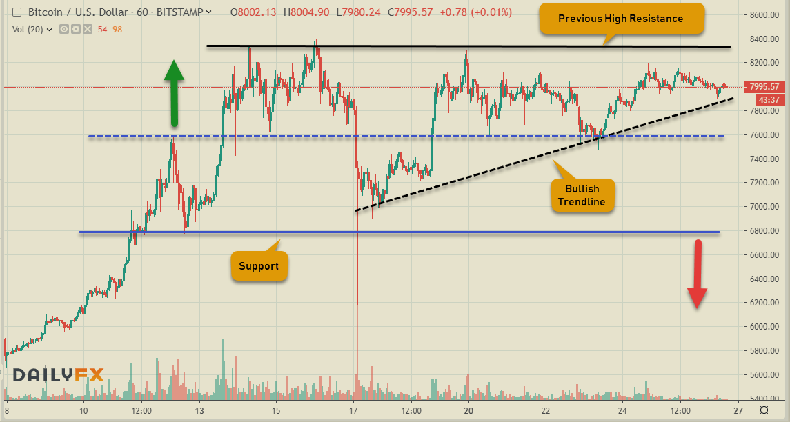 The Crypto kingpin has led the charge with the recent bull run. With higher lows respecting the Bullish trendline in the hourly chart the gains look set to continue as long as the support @ $6800 holds. For now BTC is positioning for taking another stab at the previous high with the immediate short-term support @ $7600. Bitcoin is moving ever closer to the psychological mark of $10K, which could be a signal to an extended bull run.