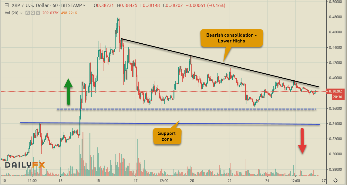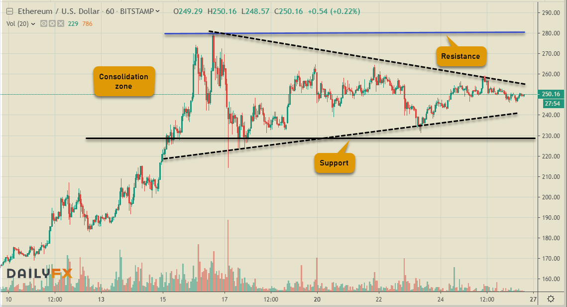 The leader of the Alt. coins, Ethereum has moved into a tight squeeze with lower highs & higher lows – a sign of an imminent breakout in either direction. Although with the general health of the Crypto market, it is favored to be on the upside. Sideways consolidation from the recent highs is about to come to an end soon. Any downside should be well supported around the $230 mark.